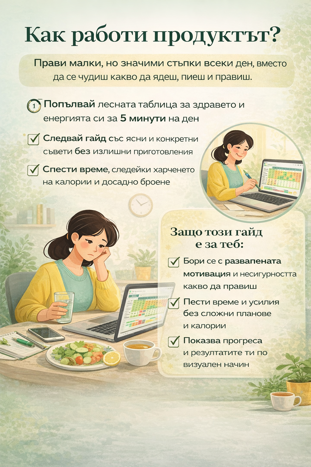 1️⃣ Попълвай таблицата ежедневно – хранене, вода, сън, енергия, настроение
